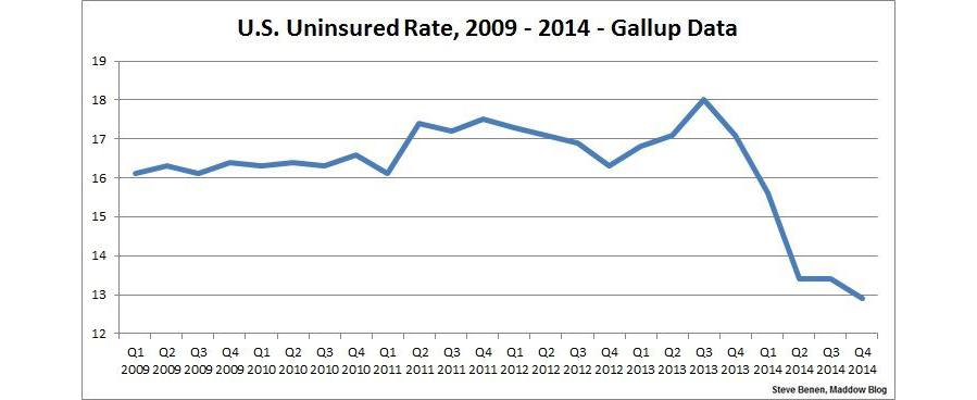 As we discussed a couple of weeks ago, the sharp improvement in the uninsured rate comes against the backdrop of a strong open-enrollment period and a whole host of related reports, including encouraging data on premiums, customer satisfaction rates, the lowest increase in health care spending in 50 years, the growing number of insurers who want to participate in exchange marketplaces, high enrollment totals with consumers who paid their premiums, the efficacy of Medicaid expansion, the efficacy of the medical-loss ratio, and reduced medical errors system-wide.