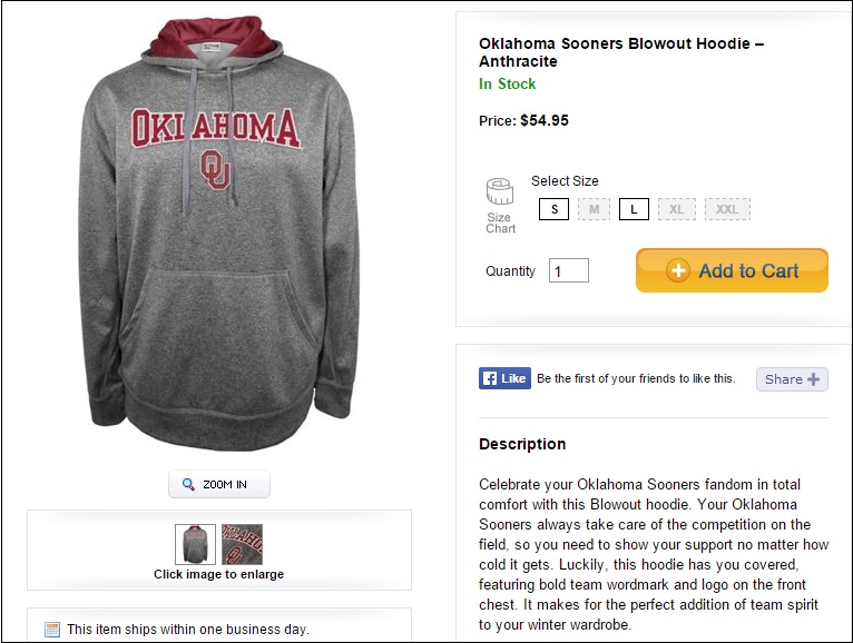 In the calm before the legislative season, it seems worth pointing out that the state of Oklahoma itself sells hoodies. The mighty University of Oklahoma Sooners, for example, will sell you several different versions on the classic hoodie, including the Oklahoma Sooners Blowout Hoodie in anthracite.