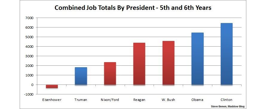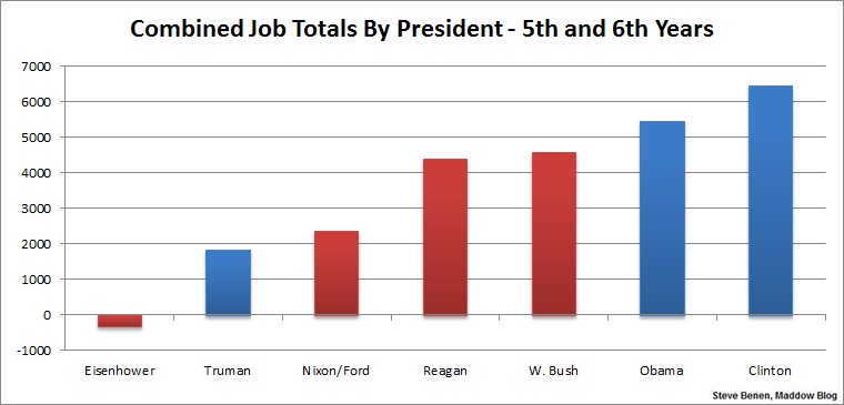 Just for kicks, let's compare Obama's job creation in his 5th & 6th years against other modern two-term presidents.