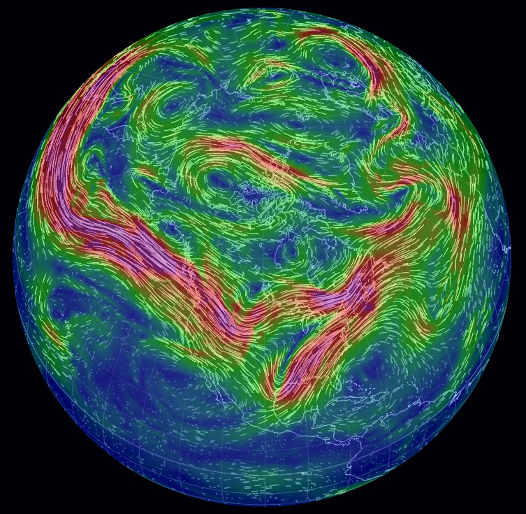 What I want is to see it, so I’m using a map called, I think, earth, built by a web developer named Cameron Beccario, who was inspired by the Wind Map we last looked at here in the lead-up to Hurricane Sandy. But Beccario has taken the Wind Map to a whole new level by offering it world-wide on a variety of map layouts and with options for different altitudes and dates. The data, drawn from NCEP, the National Weather Service, and NOAA, updates every three hours.