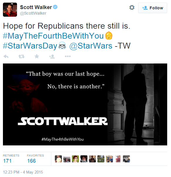 The unannounced Republican presidential candidate included an image — Yoda on one side, Walker in silhouette on the other — with familiar dialog from the franchise. “That boy was our last hope…. No, there is another.” The image includes the governor’s name in the classic “Star Wars” font.