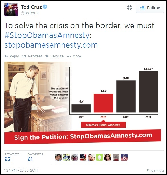 First, there’s a correlation/causation problem — for Cruz, the humanitarian crisis followed the DACA policy, which means the DACA policy caused the humanitarian crisis. In reality, DACA doesn’t appear to have much to do with the unaccompanied children from Honduras and El Salvador, who are fleeing violence and poverty, and taking advantage of a 2008 policy approved by Bush/Cheney.