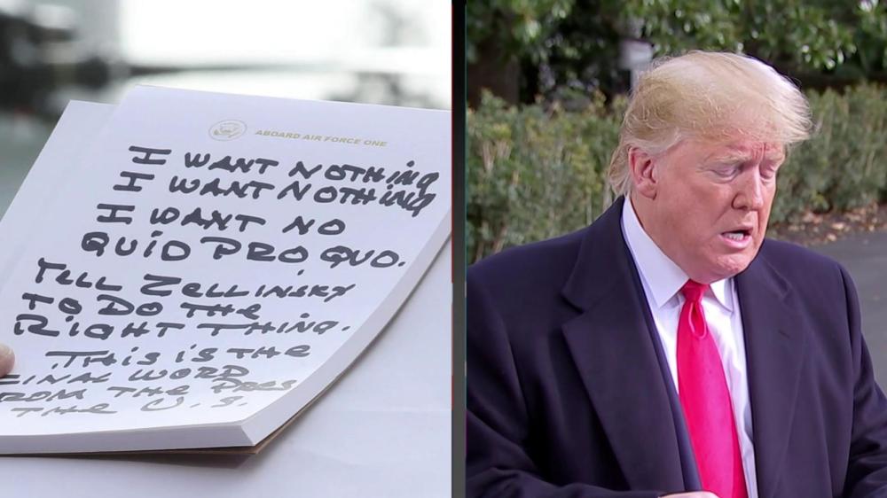 Sondland told lawmakers about a conversation with the president in early September, in which Trump purportedly told the ambassador something to the effect of, “I want nothing. I want nothing. I want no quid pro quo. Tell [Ukrainian President Volodymyr] Zelensky to do the right thing.”