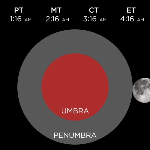 Note, nothing really interesting happens until the Moon enters the Earth’s umbra (the darkest part of Earth’s shadow), so you should not feel pressure to get up when the eclipse technically starts. Get that extra hour of sleep before the real show starts.