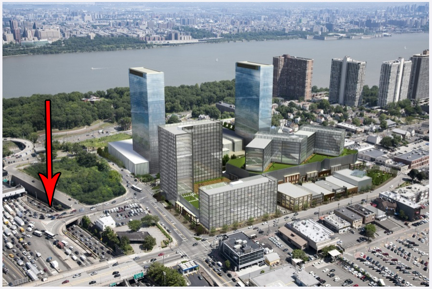 The renderings below by Martin Demczyk for Arquitectonica (with red arrows added for the sake of orientation) show the value of the Fort Lee on-ramp to the development.