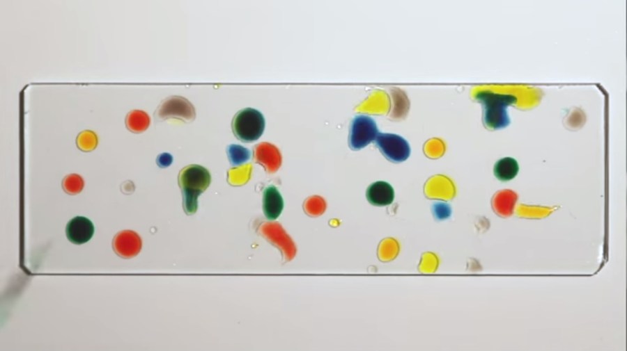 The various dances you see in the video are the result of drops with varying mixtures of water versus propylene glycol that the researched experimented with to see how the motion of the droplets would change. They found they could make drops appear to chase each other and align. It’s an amazing glimpse into how complexity can arise from such a simple set-up.
