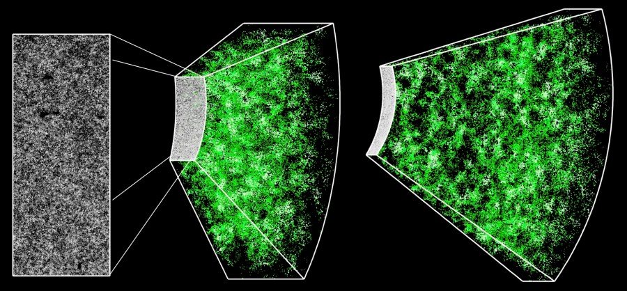This is one slice through the map of the large-scale structure of the Universe from the Sloan Digital Sky Survey and its Baryon Oscillation Spectroscopic Survey. Each dot in this picture indicates the position of a galaxy 6 billion years into the past.