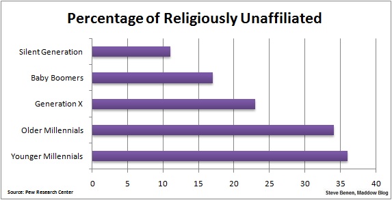 The percentage of the U.S. population moving away from religious beliefs and institutions has never been higher — and the age gap is the most striking detail.