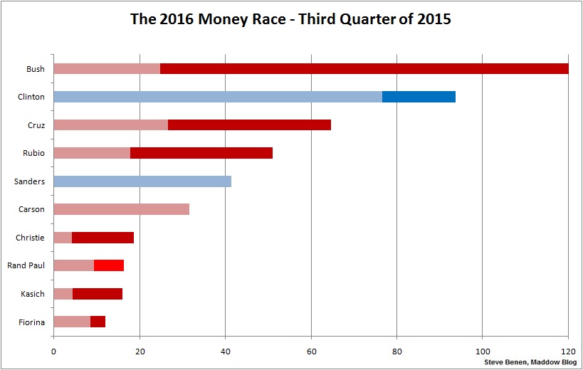 What’s more, you’ll note that the frontrunner for the Republican nomination, Donald Trump, isn’t included in this chart at all, which is itself an oddity — the hyper-wealthy New York developer has raised about $5.8 million, but it doesn’t much matter because of Trump’s ability to self-finance his campaign operation.
