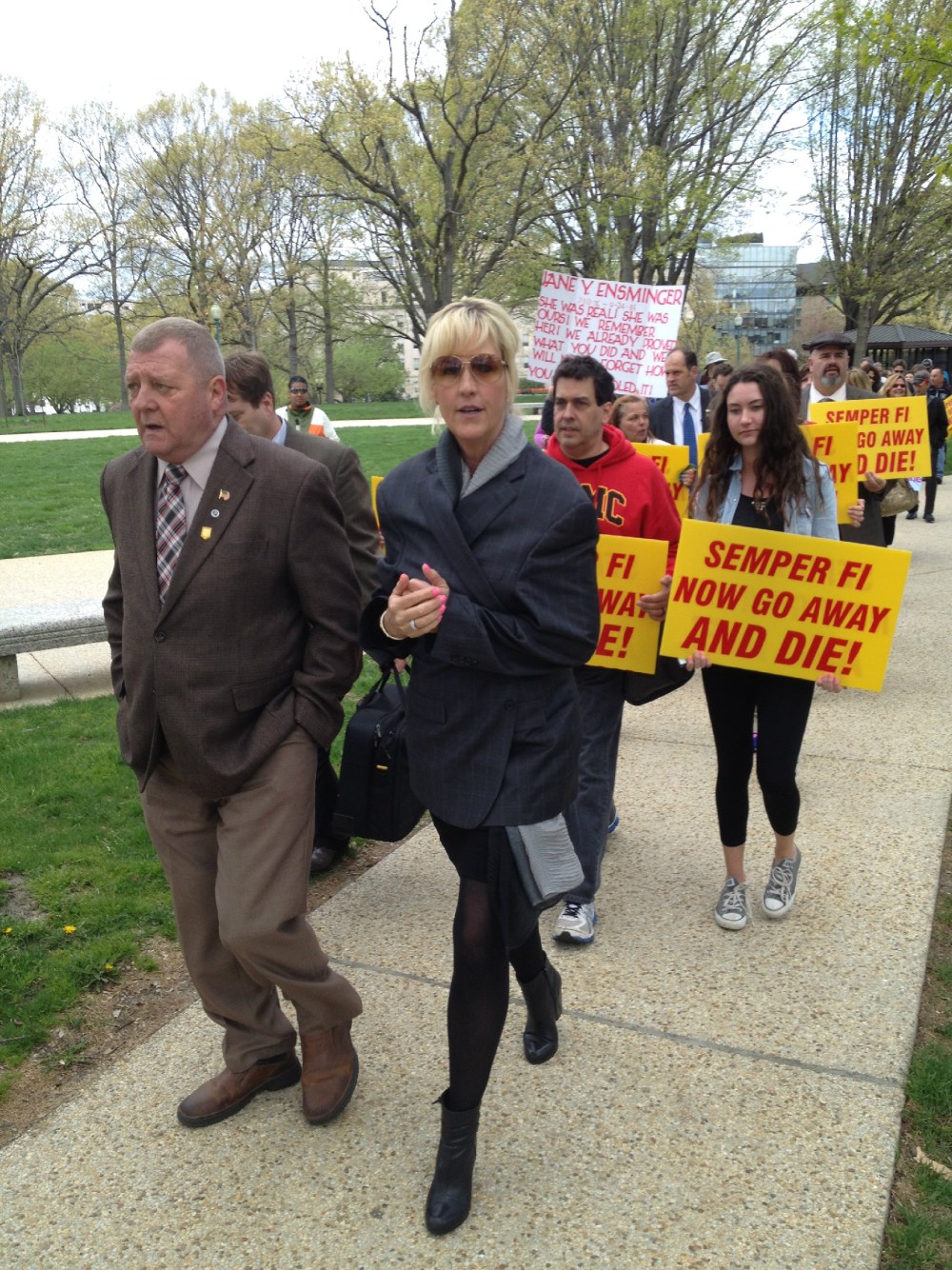 Retired Marine Master Sargent Jerry Ensminger and Erin Brockovich rallying outside the Supreme Court for Camp Lejeune victims