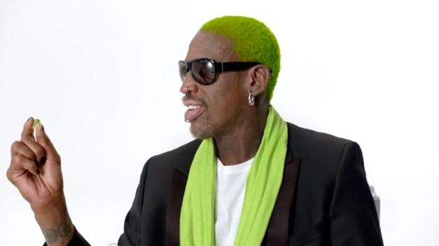 Decked out in green attire, with hair to match, Rodman pokes fun at his relationship with Kim Jong-Un when he tells him “The secret to world peace is—pistachios.”