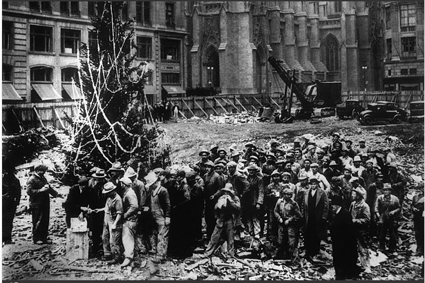 On Christmas Eve 1931, a group of Rockefeller’s employees put up a 20-foot tree in the middle of the muddy construction site. They were celebrating their relative fortune because, unlike so many Americans, they were getting paid. In the black and white photograph (below), you can see a man standing next to a crate getting ready to hand out paychecks.
