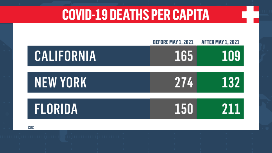 If you look at the deaths per capita in those three states before vaccines were universally available to adults, you see Florida initially had fewer deaths than New York and California. But look at the numbers after those life-saving vaccines, and New York and California’s deaths plummet, while Florida’s skyrocket.